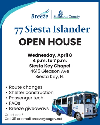 Open house event hosted by the Breeze and Sarasota County Transportation Department to discuss the following topics: